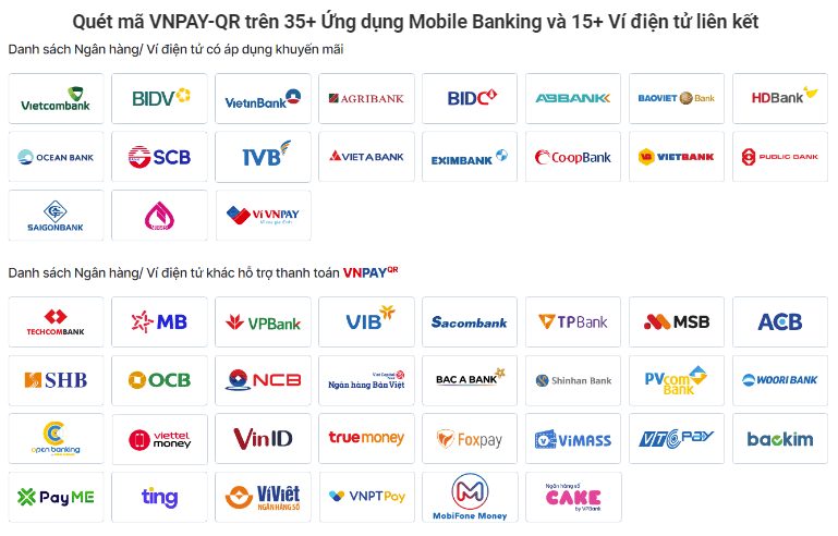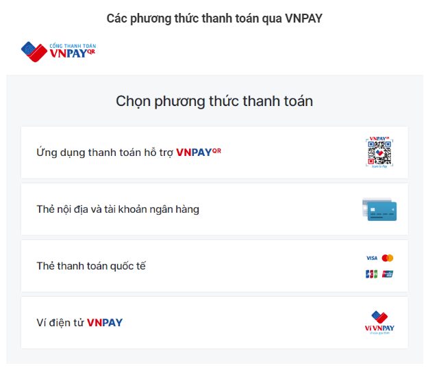 Cổng thanh toán VNPAY là giải pháp thanh toán do Công ty Cổ phần Giải pháp Thanh toán Việt Nam (VNPAY) phát triển. Khách hàng sử dụng thẻ/tài khoản ngân hàng, tính năng QR Pay/VNPAY-QR được tích hợp sẵn trên ứng dụng Mobile Banking của các ngân hàng hoặc Ví điện tử liên kết để thanh toán các giao dịch và nhập mã giảm giá (nếu có)